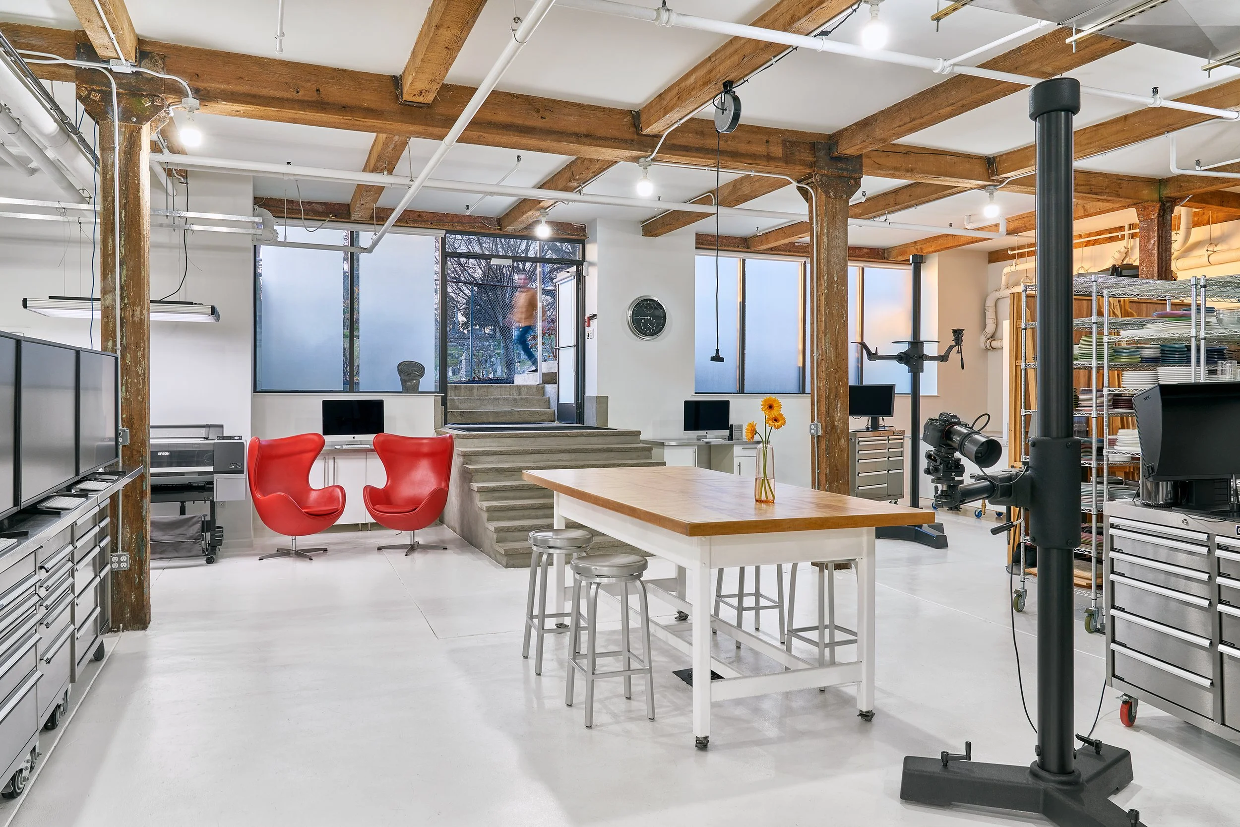 multiple sets / large commercial kitchen / food storage / prop room / post-production workstations / client meeting space / large format printer / motion control cinema robot / full stills + video equipment arsenal